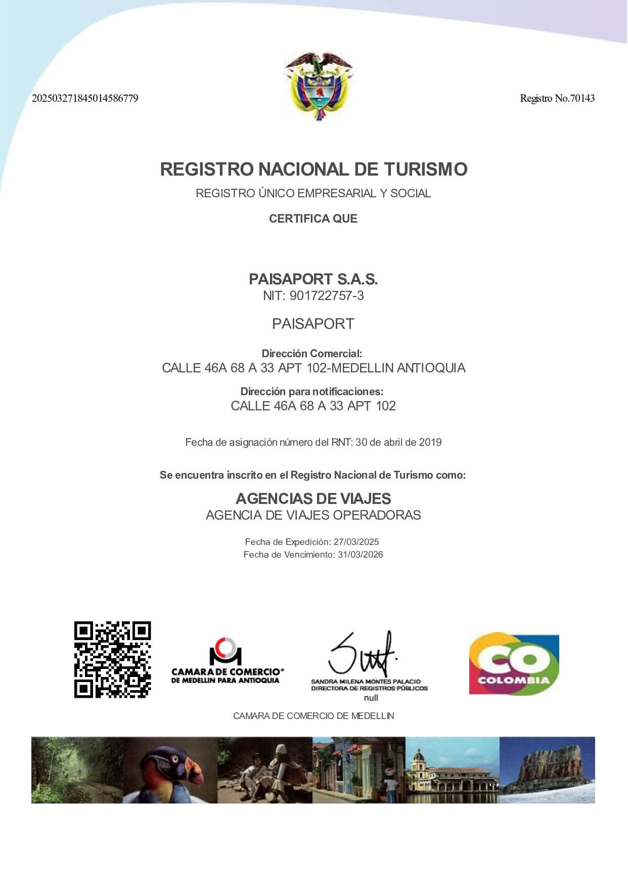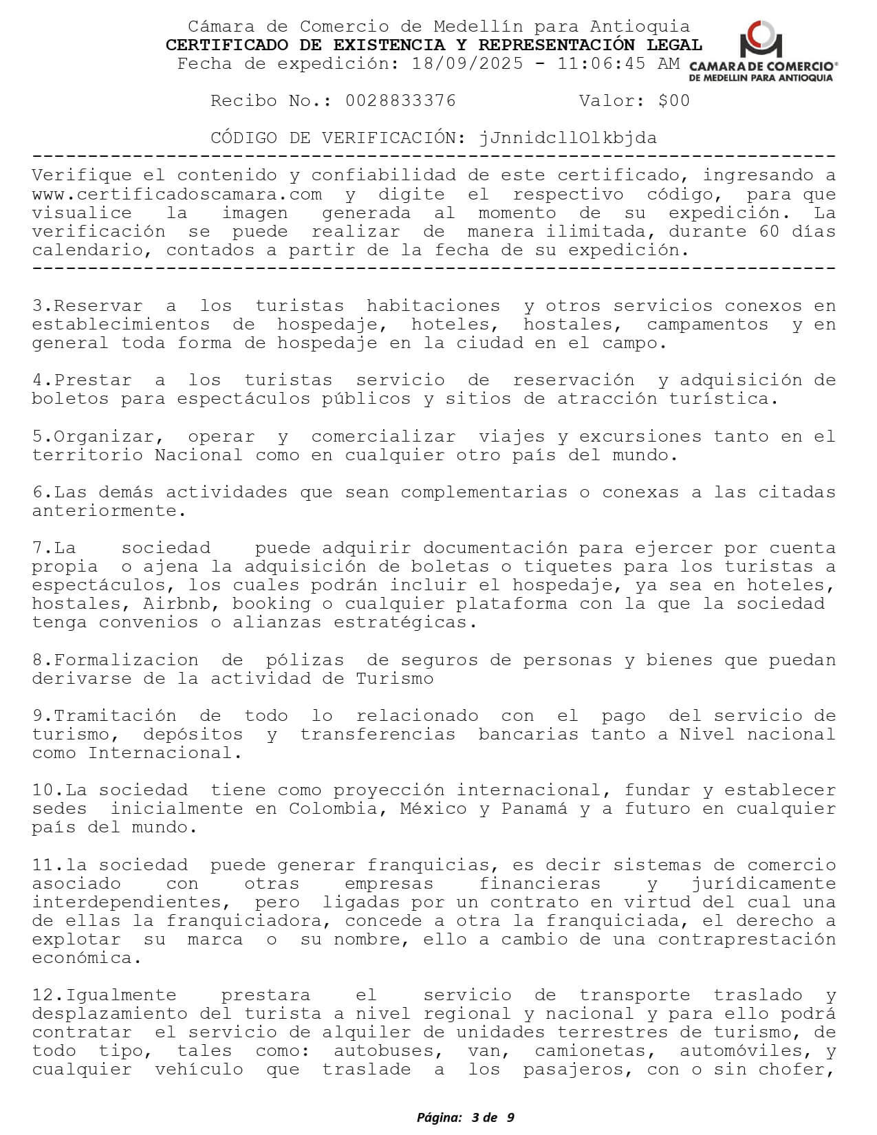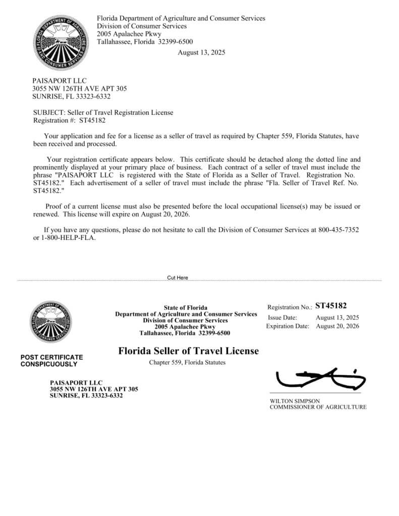 Nosotros como empresa tenemos todos los documentos que avalan nuestra operación como agencia de turismo. Registro Nacional de Turismo Asociación Internacional de Transporte Aéreo (IATA) Registro ÚnicoTributario PCI DSS SAQ Certification v4.0 Certificado de Existencia y Representación Legal Florida Seller of Travel License Certificado de Industria y Comercio Certificado de Implementación SG-SST Aviso de Operación y Licencia Panamá Cámara de Comercio Honduras Permiso de Operaciones Honduras Certificado SECOP II